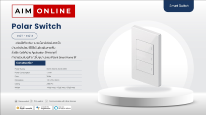 Polar switch(1 gang) สวิตช์ไฟ ขนาดบลอคสวิตช์ 4x2 (มาตรฐานไทย)ไม่ใช้สายนิวตรอน ขอราคาพิเศษและสอบถามข้อมูลเพิ่มเติมติดต่อ Mobile : 063-879-9917Line ID : @aimonlineTel : 02-088-5290 (สินค้ายังไม่รวมภาษีมูลค่าเพิ่ม,ค่าขนส่ง ,ราคาอาจมีการเปลี่ยนแปลงได้ โดยไม่แจ้งให้ทราบล่วงหน้า)