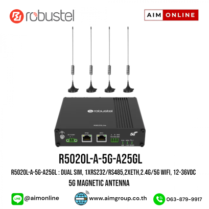 R5020L-S1 5G Magnetic Antenna : รุ่น R5020L-A-5G-A25GL-2 Dual SIM, 1xRS232/RS485,2xETH,2.4G/5G WiFi, 12-36VDC ราคาพิเศษนี้เฉพาะลูกค้าที่สั่งซื้อผ่านระบบ Online เท่านั้น สอบถามข้อมูลเพิ่มเติมติดต่อฝ่ายขาย Line ID : @aimonline ฝ่ายขายโทร: 063-879-9917 ( สินค้ายังไม่รวมภาษีมูลค่าเพิ่ม, ค่าขนส่ง ) เช็คสต๊อกล่าสุดสินค้าก่อนสั่งซื้อ #NP24