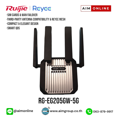 Reyee Model: RG-EG205GW-5G SIM Cards & WAN Fail over ขอราคาพิเศษสำหรับงานโครงการ ติดต่อฝ่ายขาย Line ID : @aimonline ฝ่ายขายโทร: 063-879-9917 ( สินค้ายังไม่รวมภาษีมูลค่าเพิ่ม, ค่าขนส่ง ) เช็คสต๊อกล่าสุดสินค้าก่อนสั่งซื้อ ราคายังไม่รวมค่าติดตั้ง #NP 24