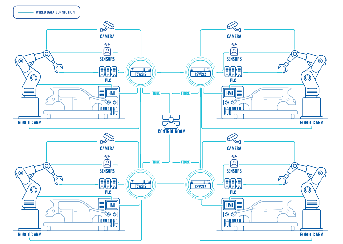 To establish access to all managed switches and end devices, a high-speed fibre optic cable can be used to interconnect this infrastructure with the control room, ultimately enabling granular management capabilities across all endpoints.