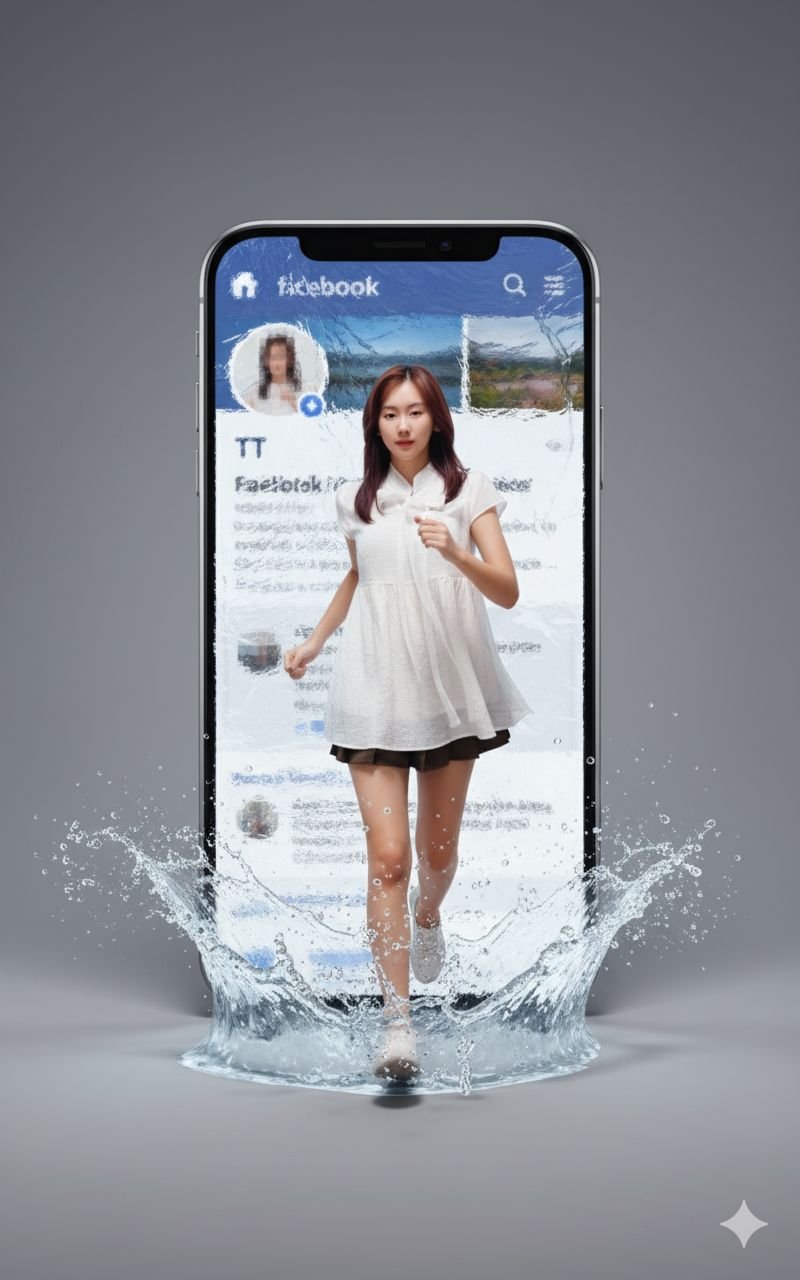 “A hyperrealistic 3D digital artwork of a people (Face and wearing from the attached photo) running out of a giant smartphone screen. The phone displays a Facebook profile page with the name "XXXXXXX" (with profile photo, cover photo and text visible). The display effect is a realistic water mosaic, as if the phone screen is made of wavy water. When stepping out, the water splashes dynamically around her legs and the ground, creating a sensation of movement.The background is minimalist and gray, which allows the effects of water and Facebook profile screen to stand out considerably.