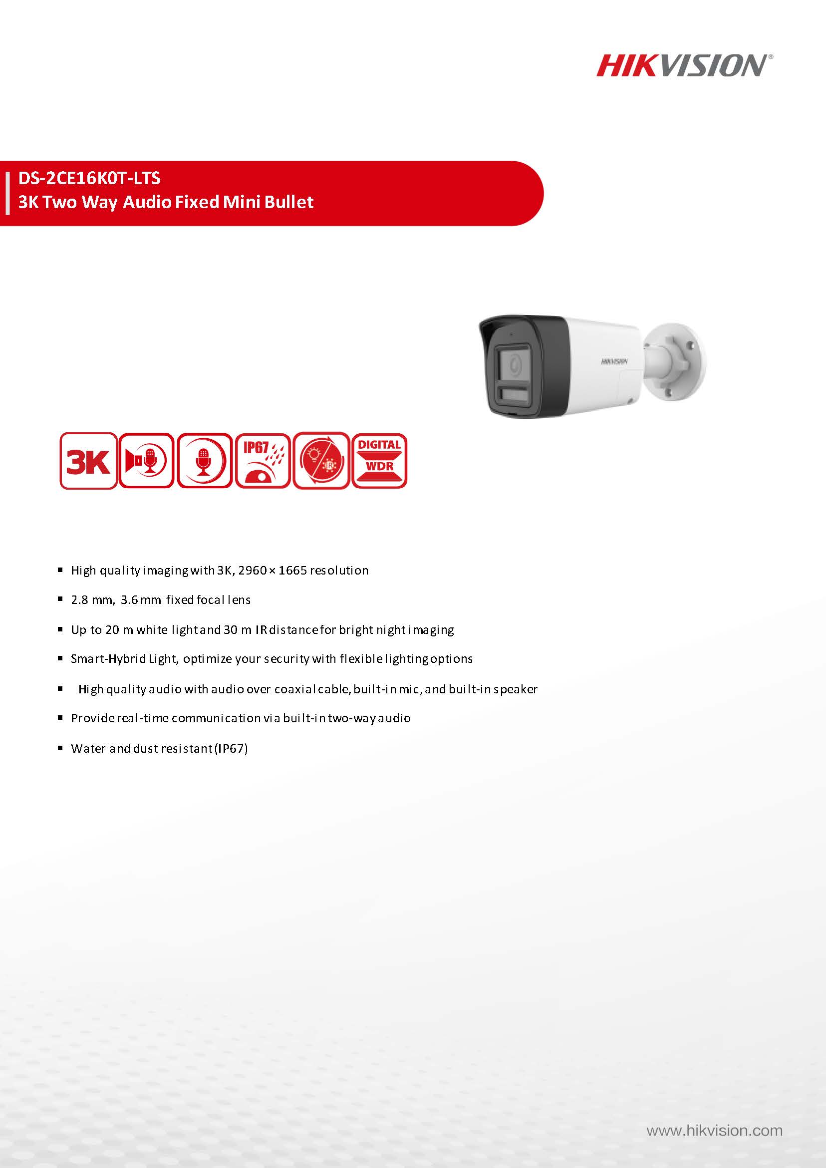 HIKVISION 3K Two Way Audio Fixed Mini BulletModel:DS-2CE16K0T-LTSขอราคาพิเศษสำหรับงานโครงการ ติดต่อฝ่ายขาย Line ID : @aimonline ฝ่ายขายโทร: 063-879-9917 (สินค้ายังไม่รวมภาษีมูลค่าเพิ่ม, ค่าขนส่ง) เช็คสต๊อกล่าสุดสินค้าก่อนสั่งซื้อ ราคายังไม่รวมค่าติดตั้ง #NP24