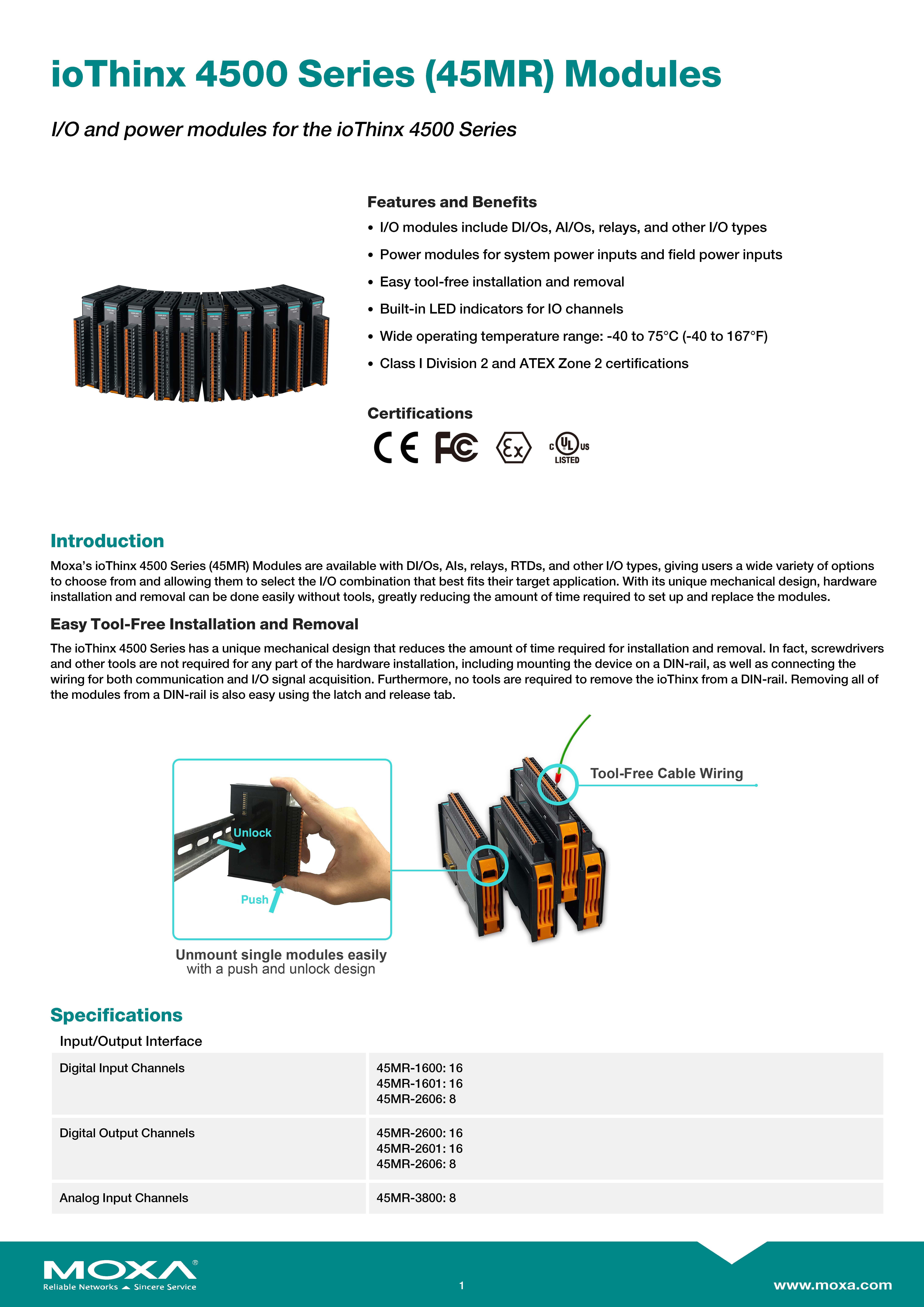 MOXA ioThinx 4500 Series (45MR) Modules I/O and power modules for the ioThinx 4500 Series Model:45MR-7210 ขอราคาพิเศษสำหรับงานโครงการ ติดต่อฝ่ายขาย Line ID : @aimonline ฝ่ายขายโทร: 063-879-9917 ( สินค้ายังไม่รวมภาษีมูลค่าเพิ่ม, ค่าขนส่ง ) เช็คสต๊อกล่าสุดสินค้าก่อนสั่งซื้อ ราคายังไม่รวมค่าติดตั้ง