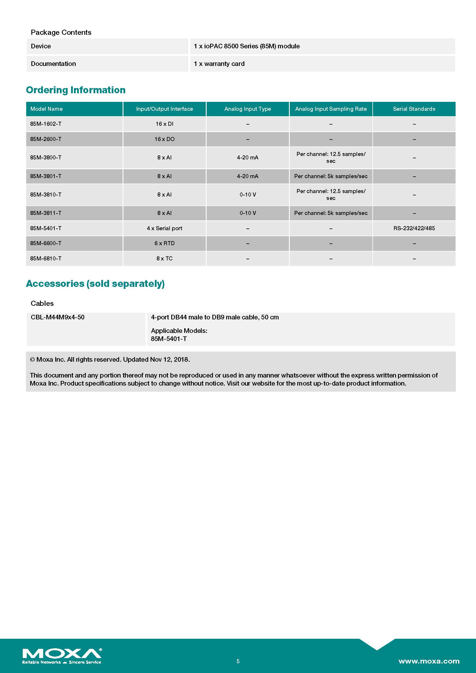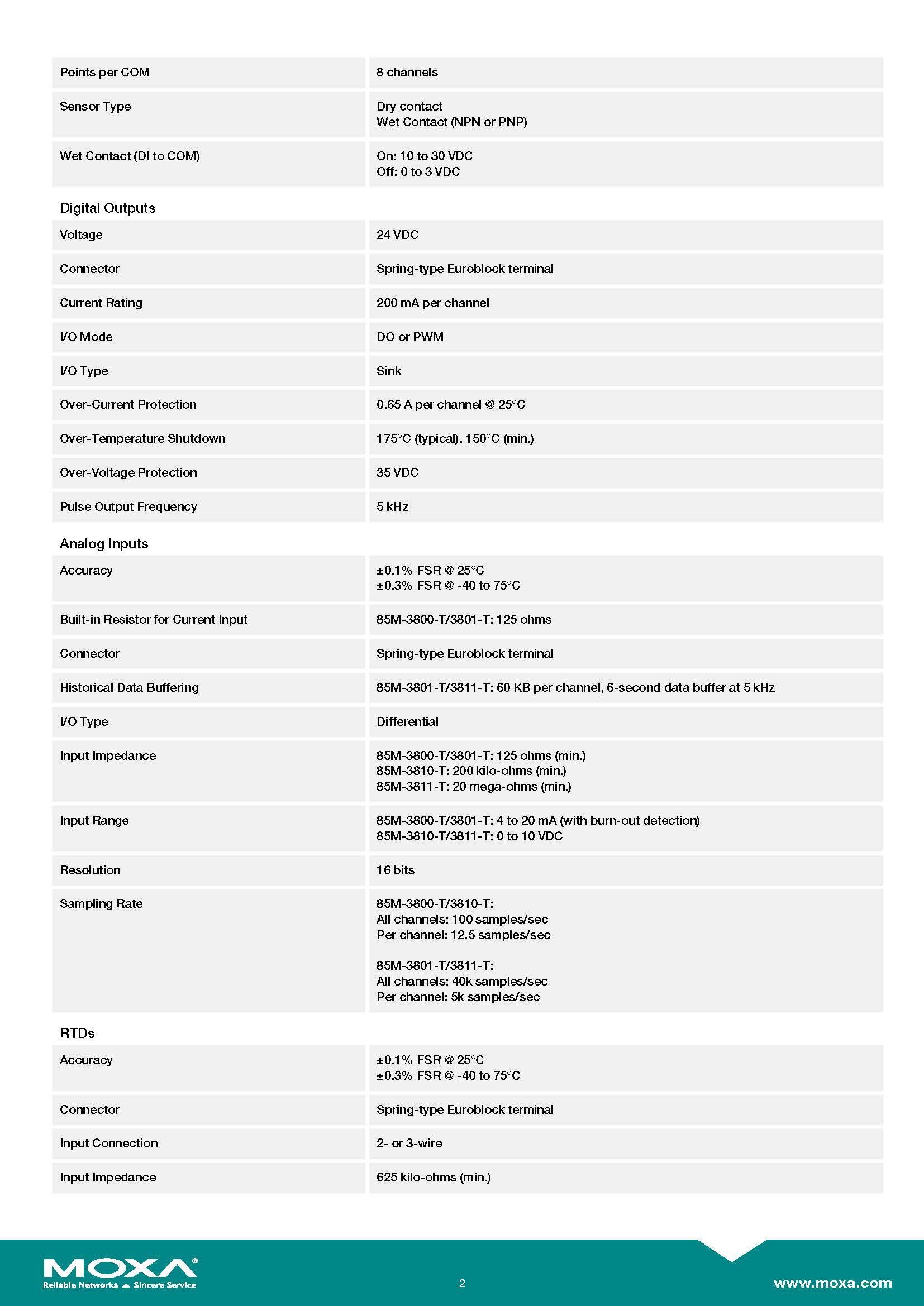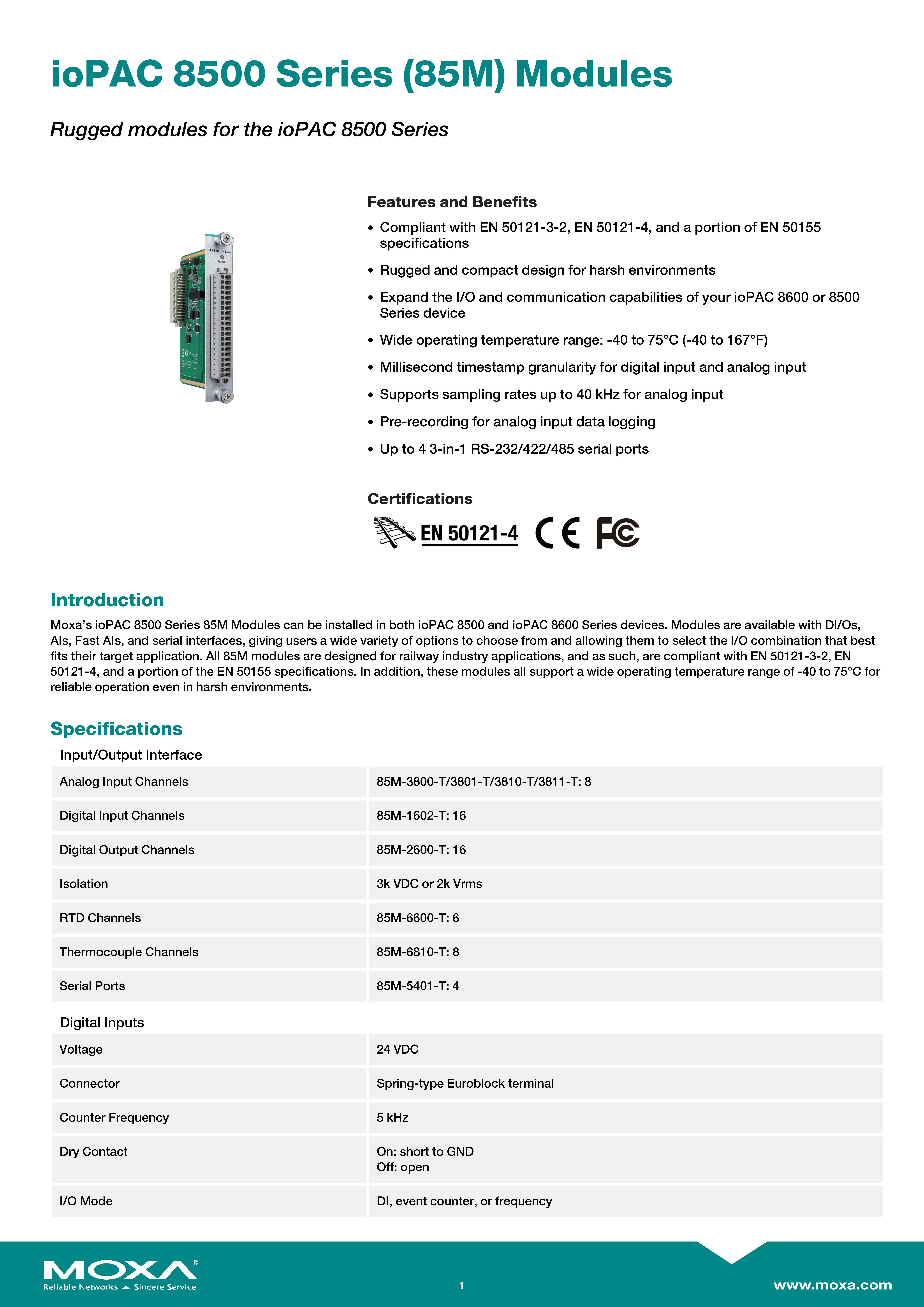 MOXA ioPAC 8500 Series (85M) Modules Model : 85M-1602-T Module for the ioPAC 8500/8600 Series, 16 DIs, 24 VDC, sink/source, -40 to 75°C operating temperature ขอราคาพิเศษสำหรับงานโครงการ ติดต่อฝ่ายขาย Line ID : @aimonline ฝ่ายขายโทร: 063-879-9917 ( สินค้ายังไม่รวมภาษีมูลค่าเพิ่ม, ค่าขนส่ง ) เช็คสต๊อกล่าสุดสินค้าก่อนสั่งซื้อ ราคายังไม่รวมค่าติดตั้ง