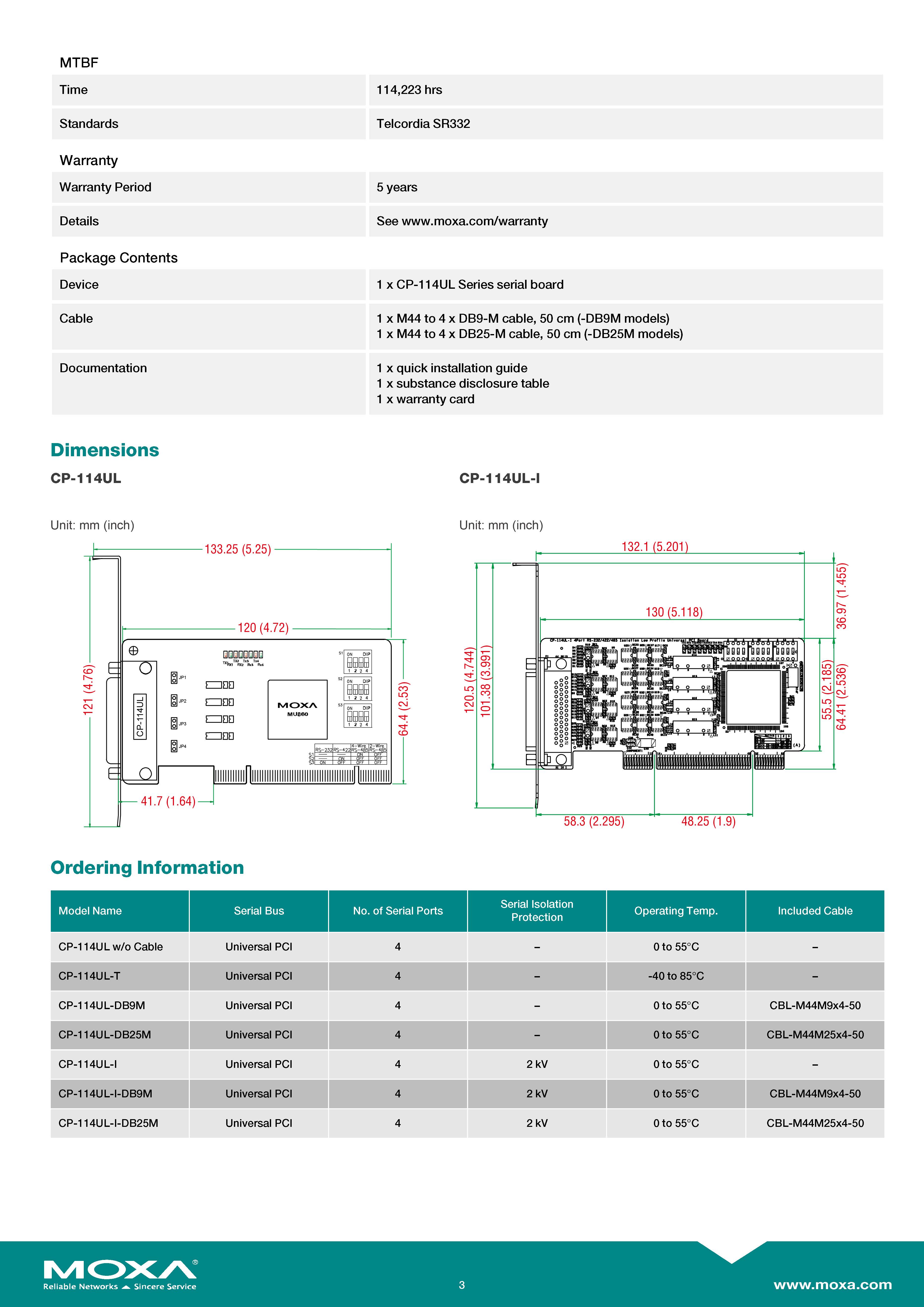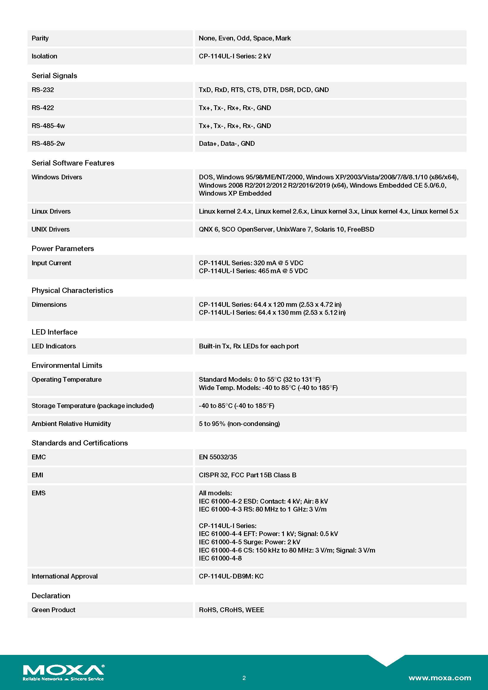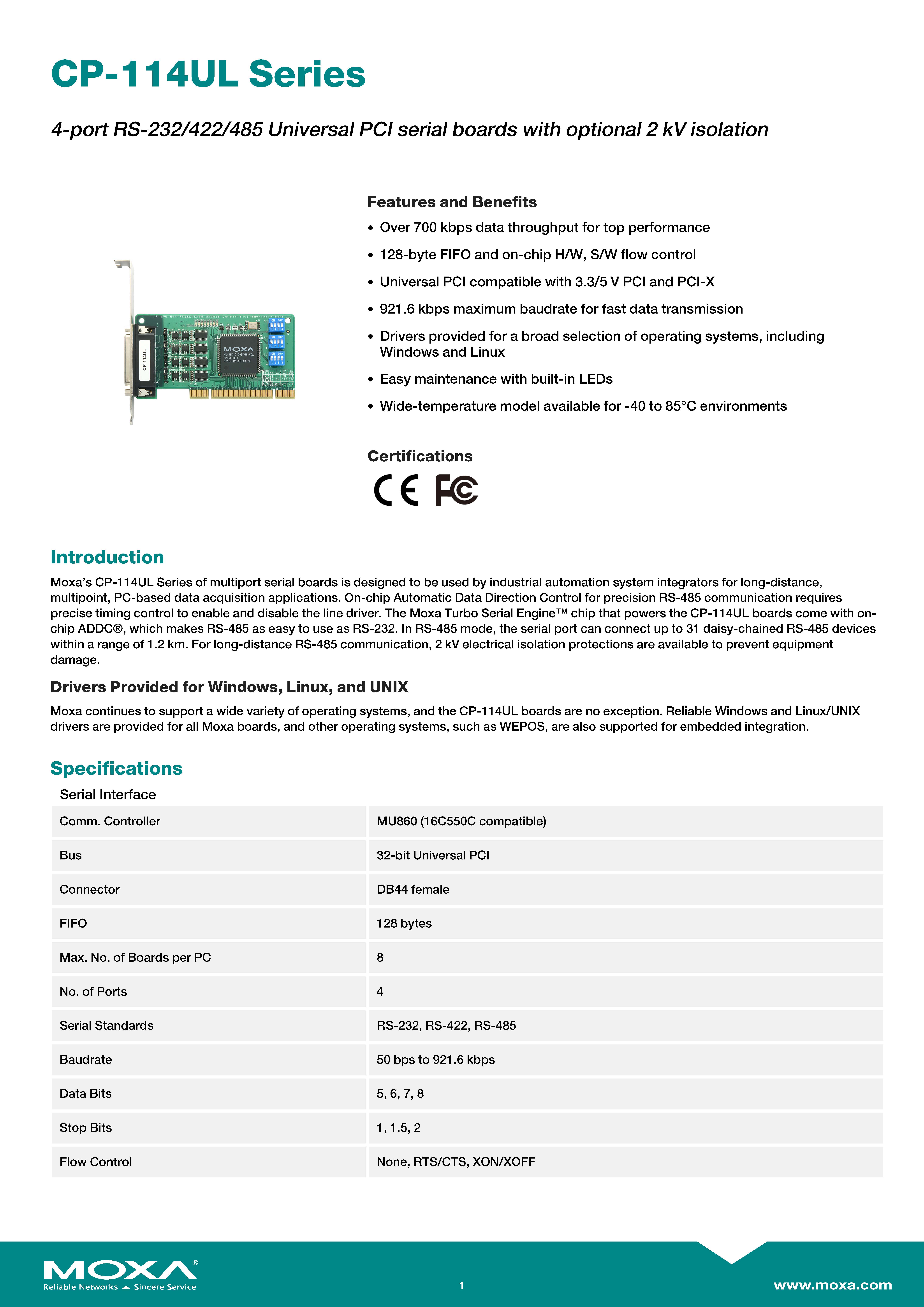 MOXA PCI Serial Cards Model: CP-114UL-I 4-port RS-232/422/485 low-profile Universal PCI serial board with optical isolation, 0 to 55°C operating temperature (includes DB9 male cable) ขอราคาพิเศษสำหรับงานโครงการ ติดต่อฝ่ายขาย Line ID : @aimonline ฝ่ายขายโทร: 063-879-9917 ( สินค้ายังไม่รวมภาษีมูลค่าเพิ่ม, ค่าขนส่ง ) เช็คสต๊อกล่าสุดสินค้าก่อนสั่งซื้อ ราคายังไม่รวมค่าติดตั้ง