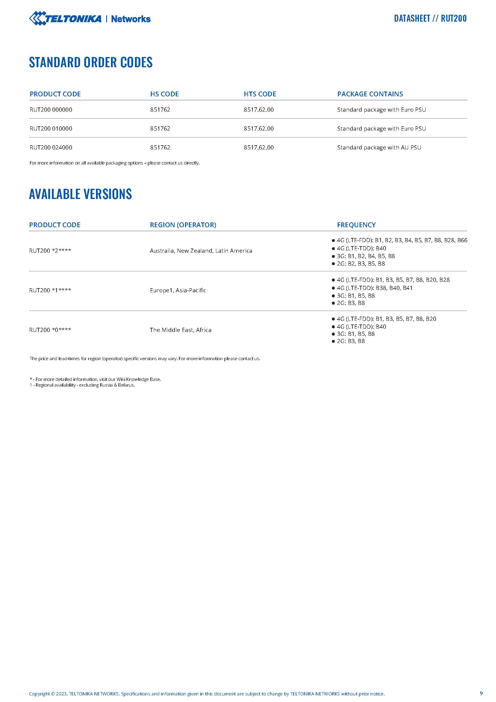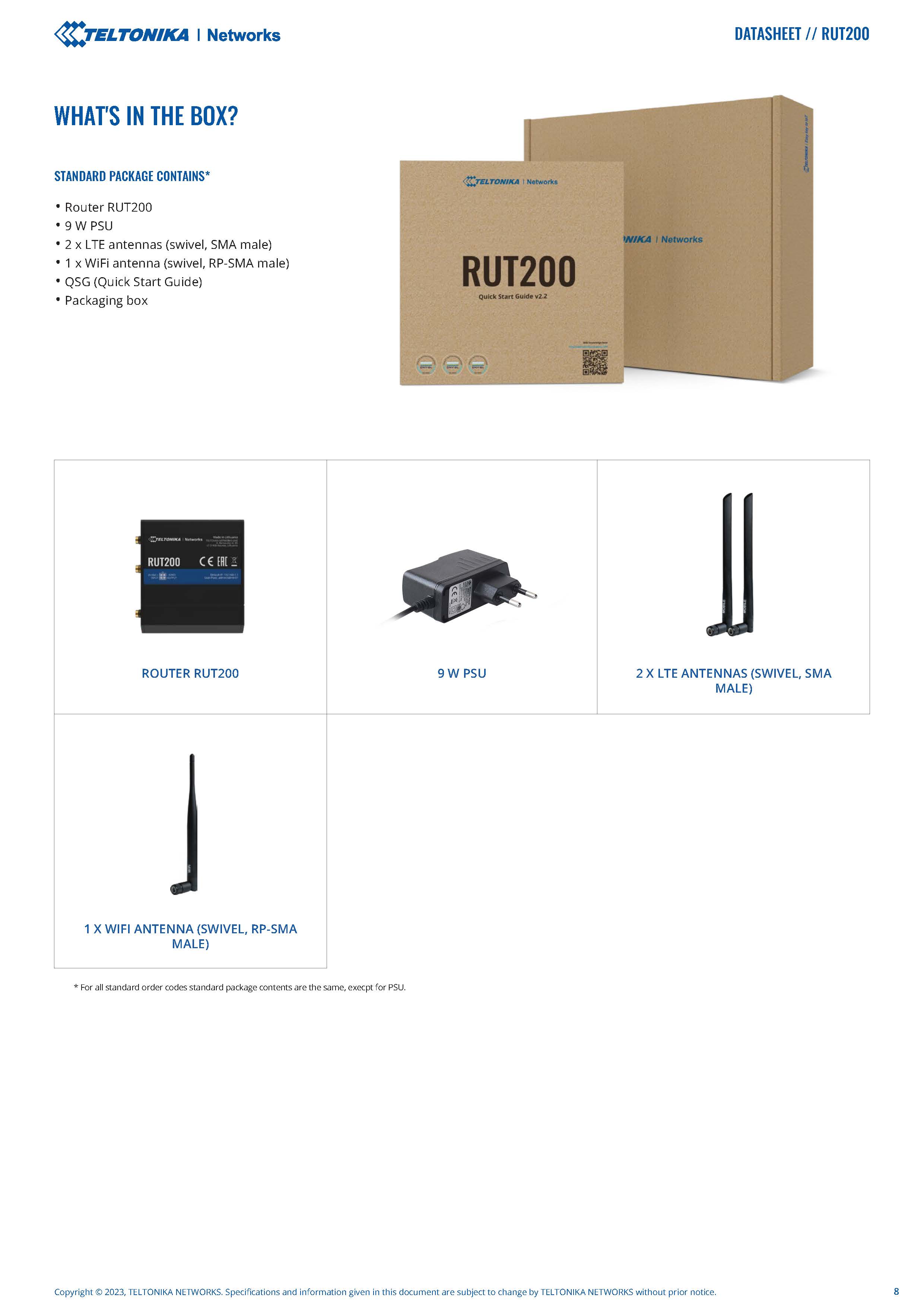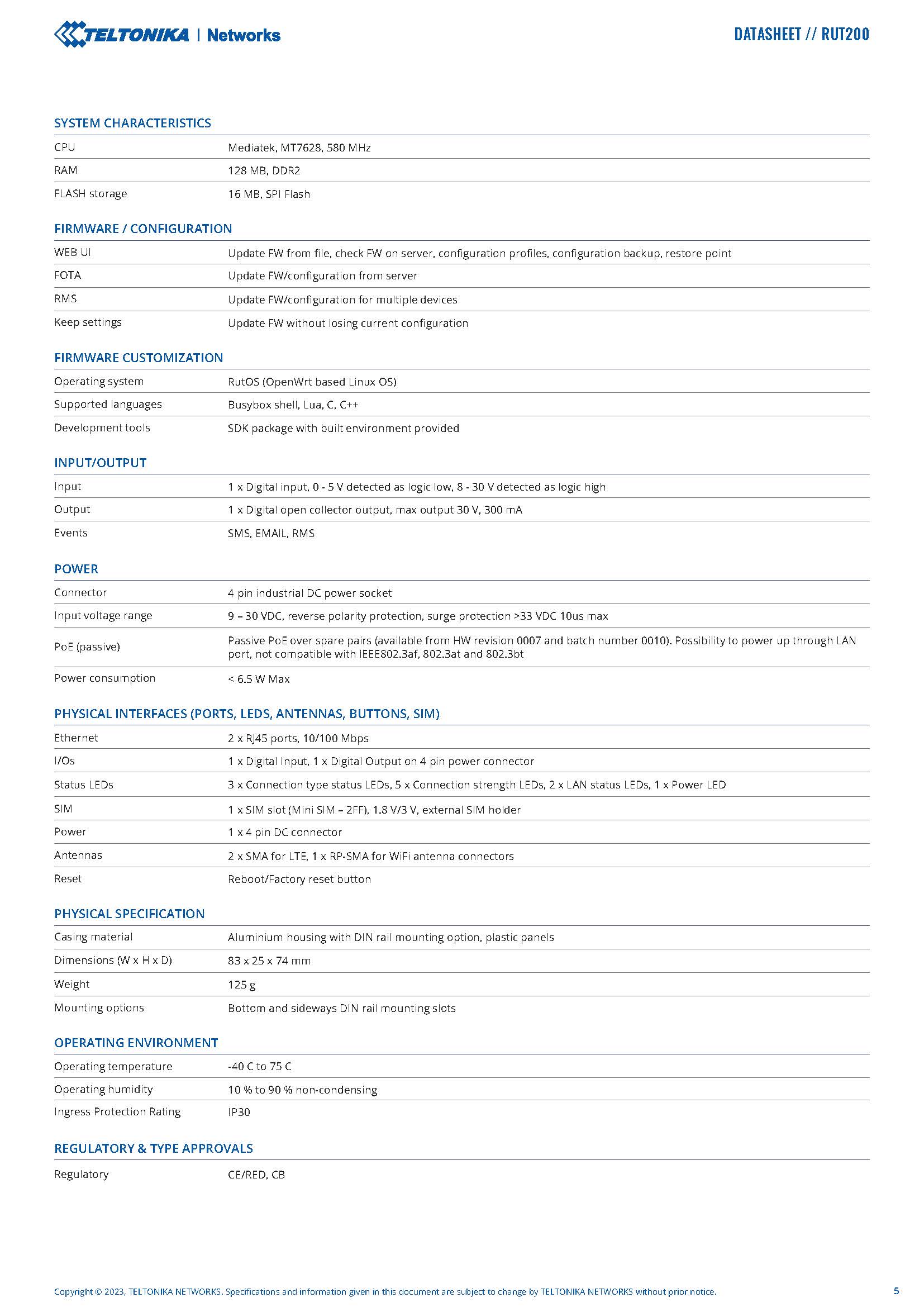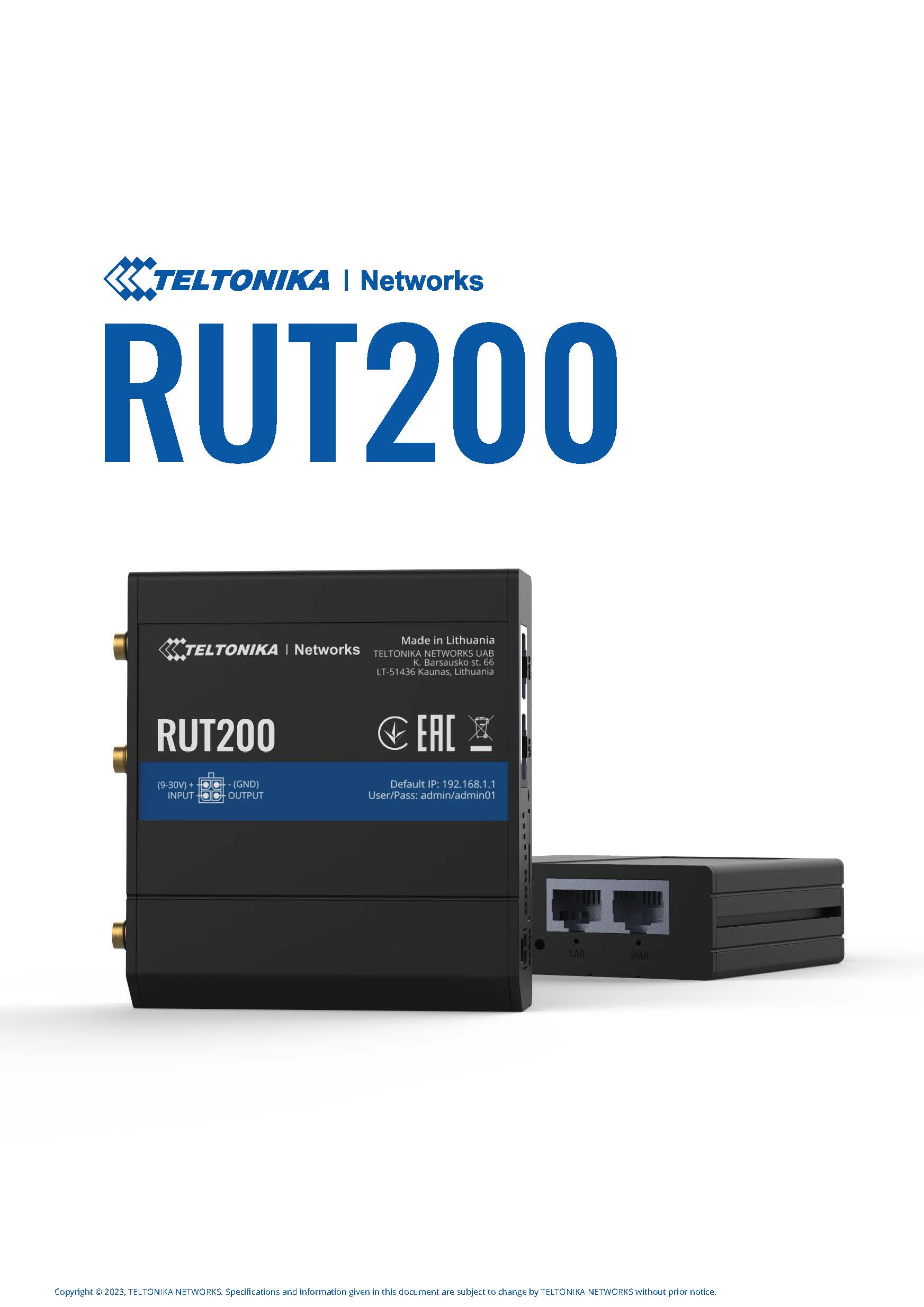TELTONIKA LTE 4G Router Model : RUT200 เราเตอร์เซลลูลาร์ (Cellular Router) ระดับอุตสาหกรรม ขนาดกะทัดรัด ถูกออกแบบมาสำหรับโซลูชัน IoT (Internet of Things) และ M2M (Machine-to-Machine) รองรับ 4G (LTE Cat 4) มีช่องใส่ ซิมการ์ด (SIM Slot) 1 ช่อง Ethernet: มี 2 พอร์ต (10/100 Mbps) โดยพอร์ตหนึ่งสามารถกำหนดค่าเป็น WAN (อินเทอร์เน็ตหลัก) และอีกพอร์ตเป็น LAN