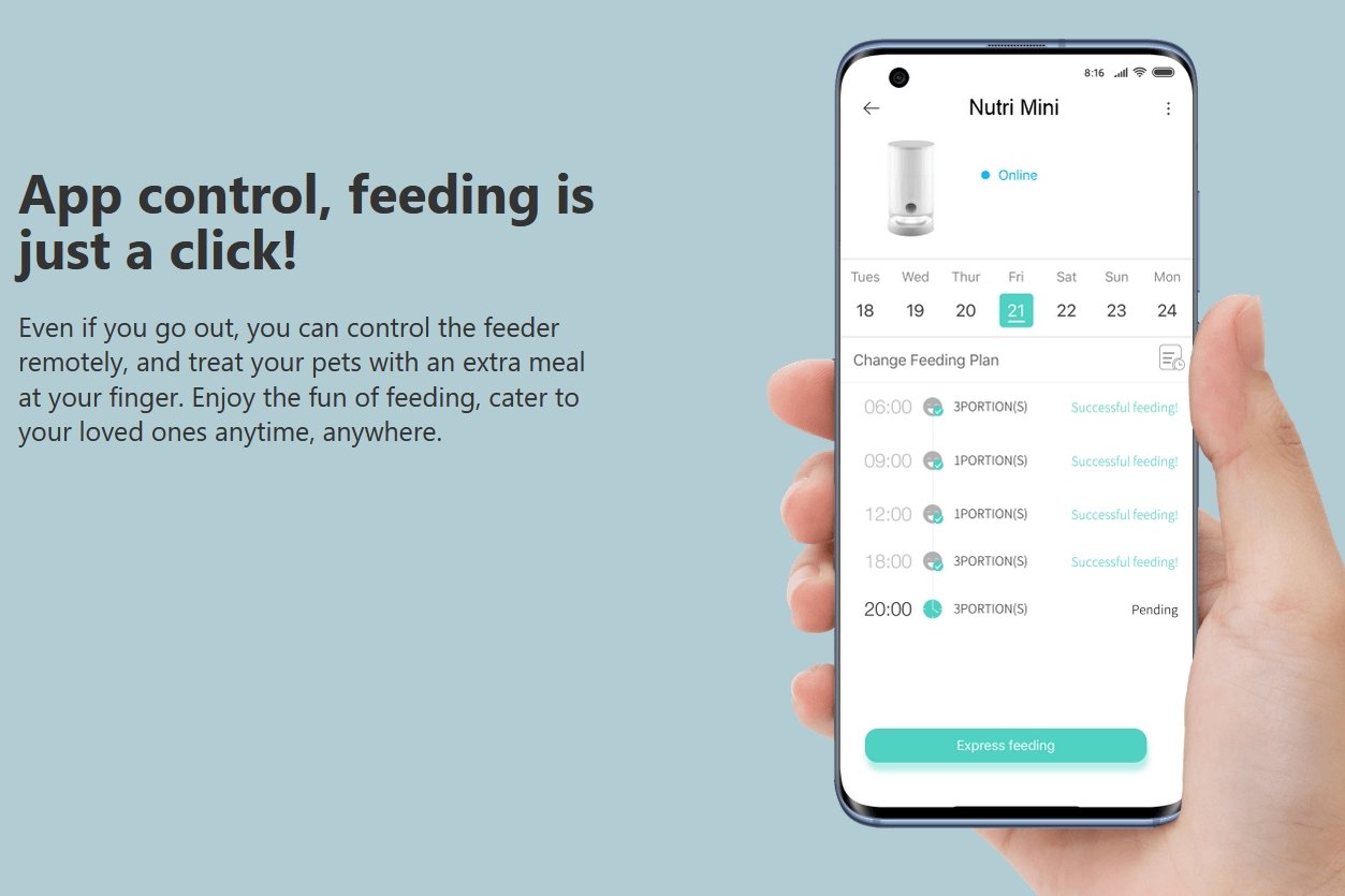 Petoneer เครื่องให้อาหารสัตว์แบบอัตโนมัติ รุ่น Nutri Mini ความจุ 2.6 ลิตร หรือ 1.2 กิโลกรัม (อาหารเม็ด) จ่ายอาหารได้ต่ำสุดครั้งละ 5 กรัม ขอราคาพิเศษสำหรับงานโครงการ ติดต่อฝ่ายขาย Line ID : @aimonline ฝ่ายขายโทร: 063-879-9917 ( สินค้ายังไม่รวมภาษีมูลค่าเพิ่ม, ค่าขนส่ง ) เช็คสต๊อกล่าสุดสินค้าก่อนสั่งซื้อ #SI