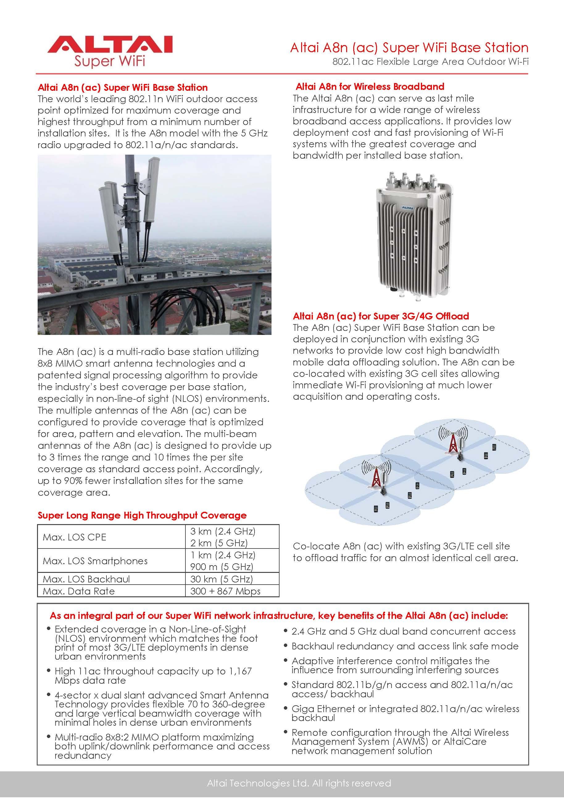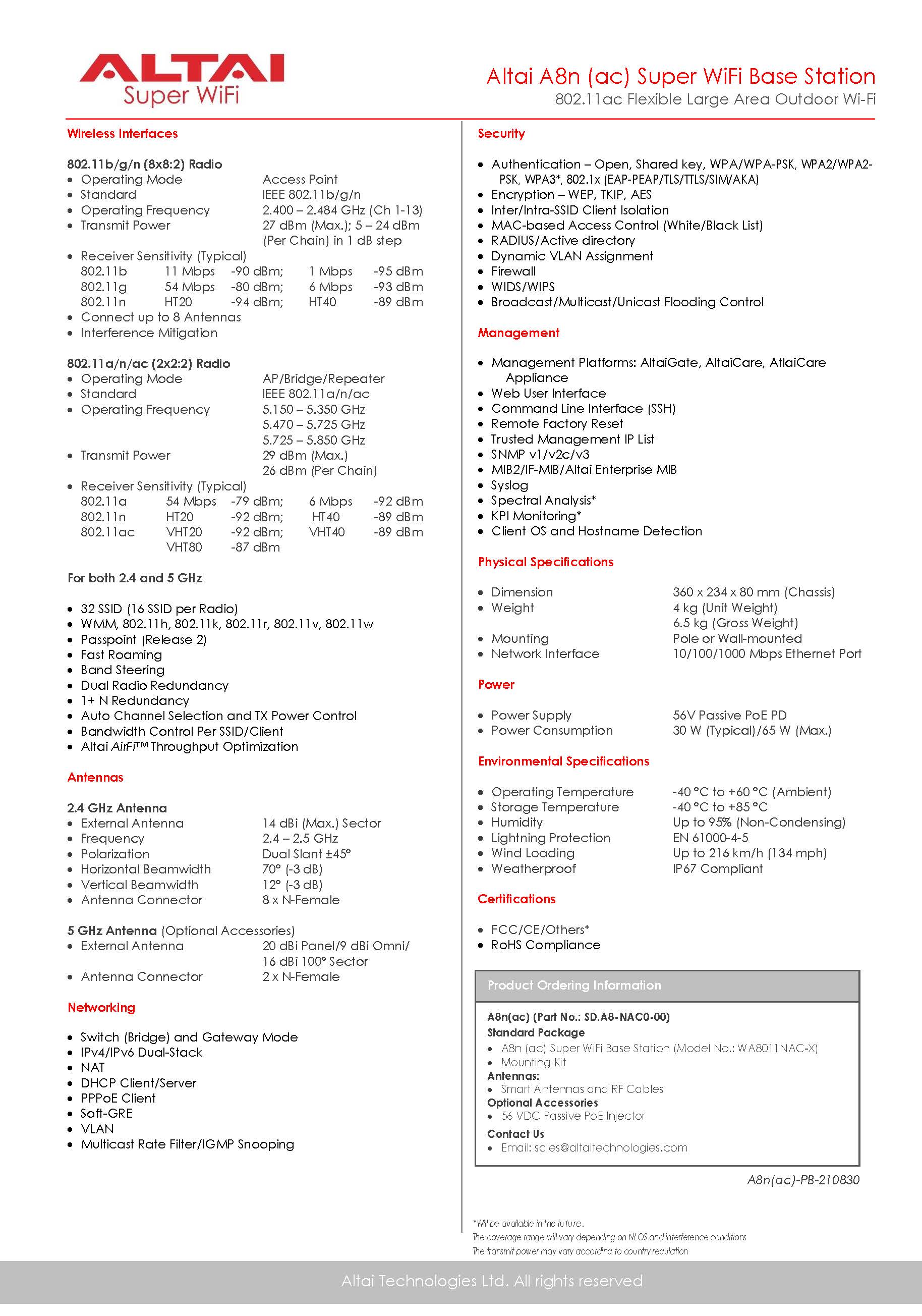ALTAI A8n (ac) Series Super WiFi Base Station รุ่น A8-NAC0-00 , 1 x A8n 802.11a/b/g/n/ac AP hardware (PoE power) , 1 x 802.11a/n/ac radio (2 external antenna ports) , 1 x base station mounting kit , 1 x Ethernet connector ขอราคาพิเศษสำหรับงานโครงการติดต่อฝ่ายขาย Line ID : @aimonline ฝ่ายขายโทร: 063-879-9917 ( สินค้ายังไม่รวมภาษีมูลค่าเพิ่ม, ค่าขนส่ง , สินค้าสั่งต่างประเทศราคาอาจมีการเปลี่ยนแปลงตามอัตราแลกเปลี่ยน โดยไม่แจ้งให้ทราบล่วงหน้า) เช็คสต๊อกสินค้าก่อนสั่งซื้อ