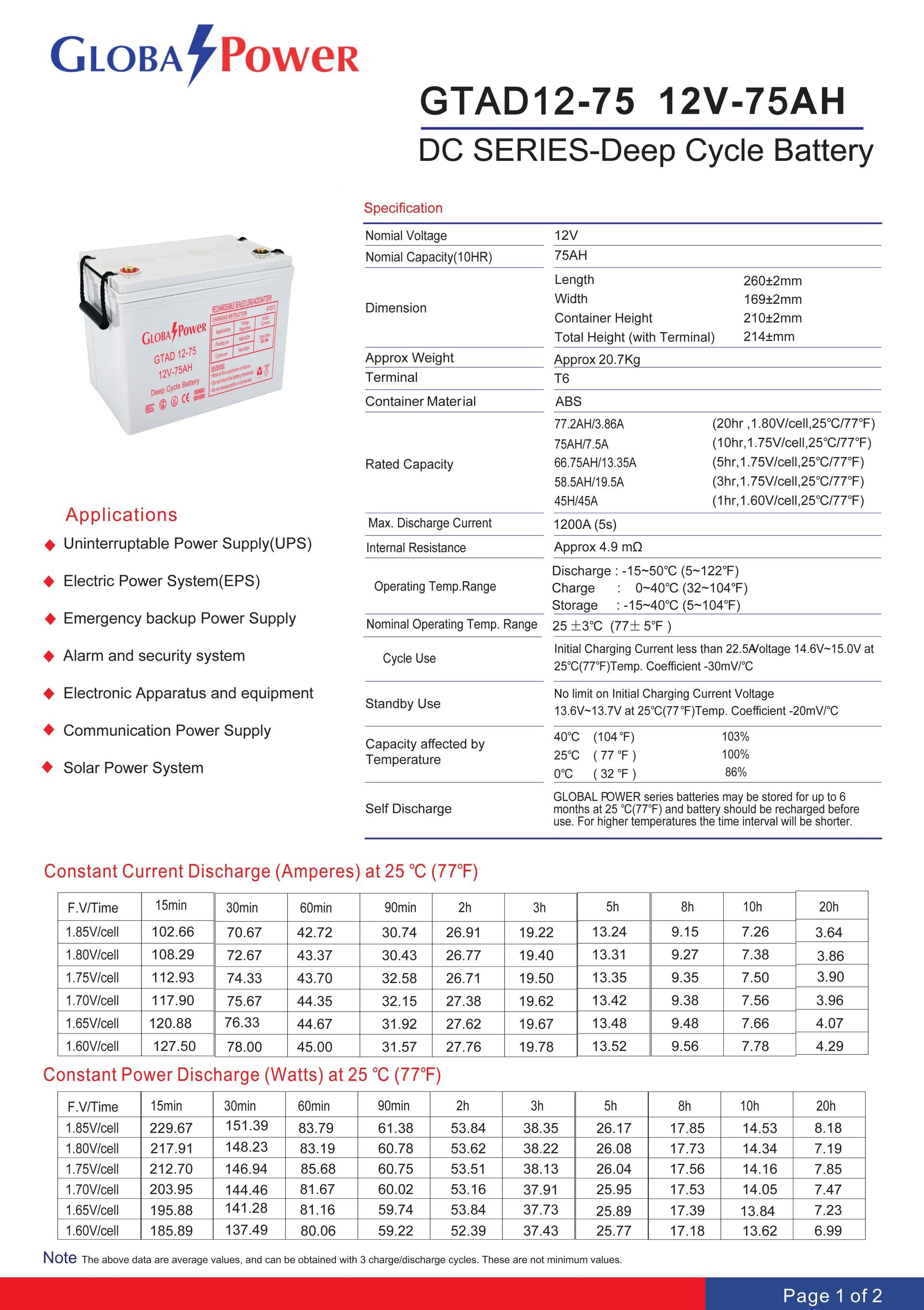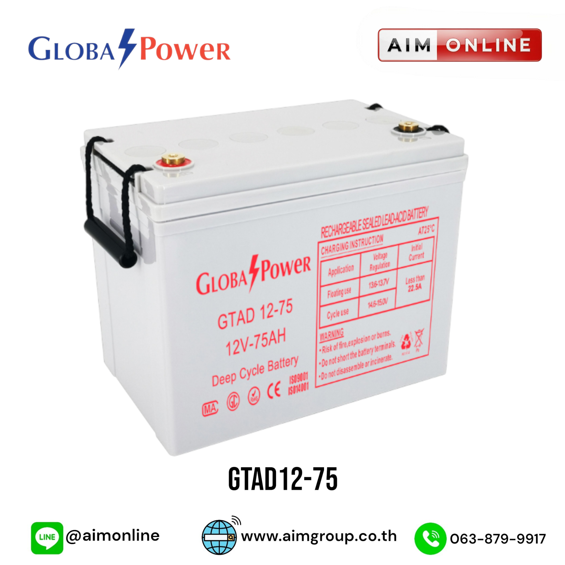 GLOBAL POWER Deep Cycle Battery DC12V 75AH รุ่น GTAD12-75 ขอราคาพิเศษและสอบถามข้อมูลเพิ่มเติมติดต่อ Mobile : 063-879-9917Line ID : @aimonline Tel : 02-088-5290 (สินค้ายังไม่รวมภาษีมูลค่าเพิ่ม,ค่าขนส่ง ,ราคาอาจมีการเปลี่ยนแปลงได้ โดยไม่แจ้งให้ทราบล่วงหน้า) #SI