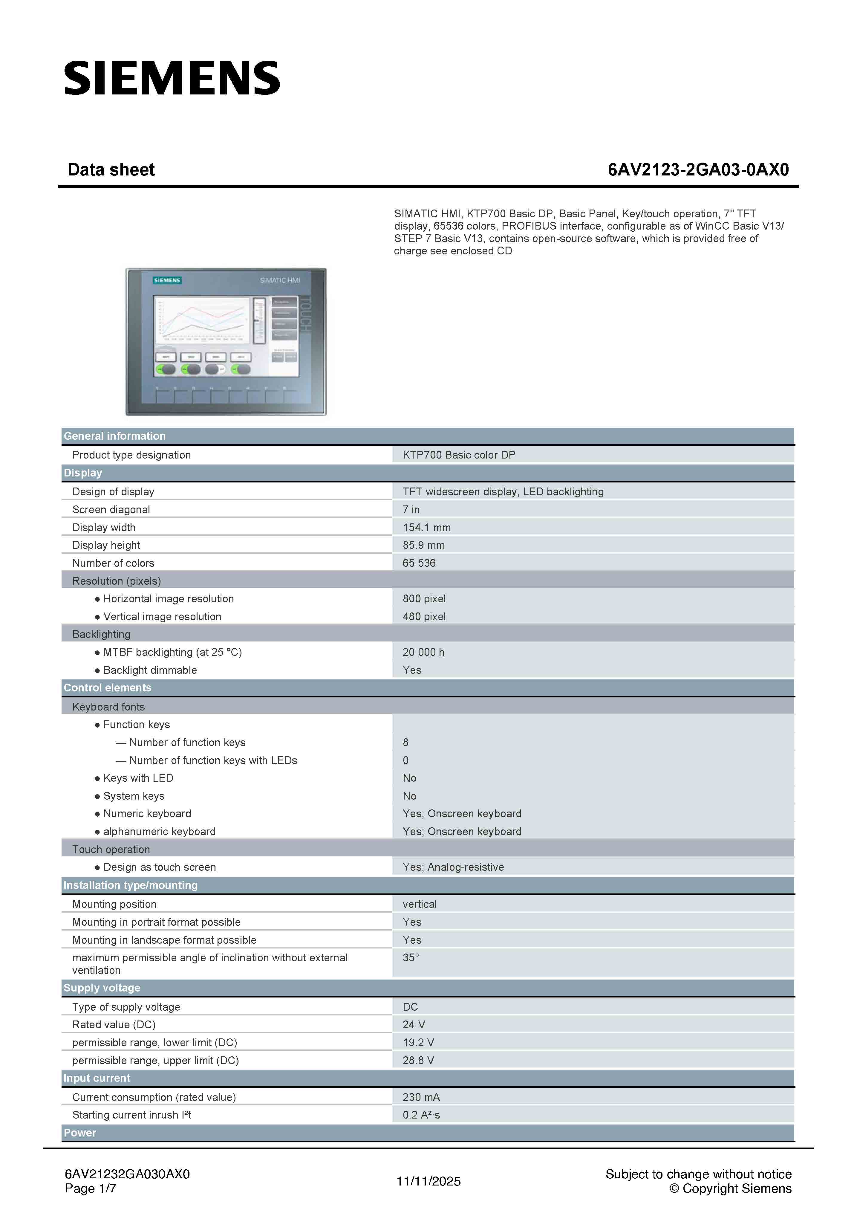 SIEMENS SIMATIC HMI,KTP700,Basic DP,7"TFT รุ่น 6AV2123-2GA03-0AX0 Resolution 800 x 480 pixels ขอราคาพิเศษและสอบถามข้อมูลเพิ่มเติมติดต่อ Mobile : 063-879-9917Line ID : @aimonline Tel : 02-088-5290 (สินค้ายังไม่รวมภาษีมูลค่าเพิ่ม,ค่าขนส่ง ,ราคาอาจมีการเปลี่ยนแปลงได้ โดยไม่แจ้งให้ทราบล่วงหน้า) # SMN-21232GA030AX0