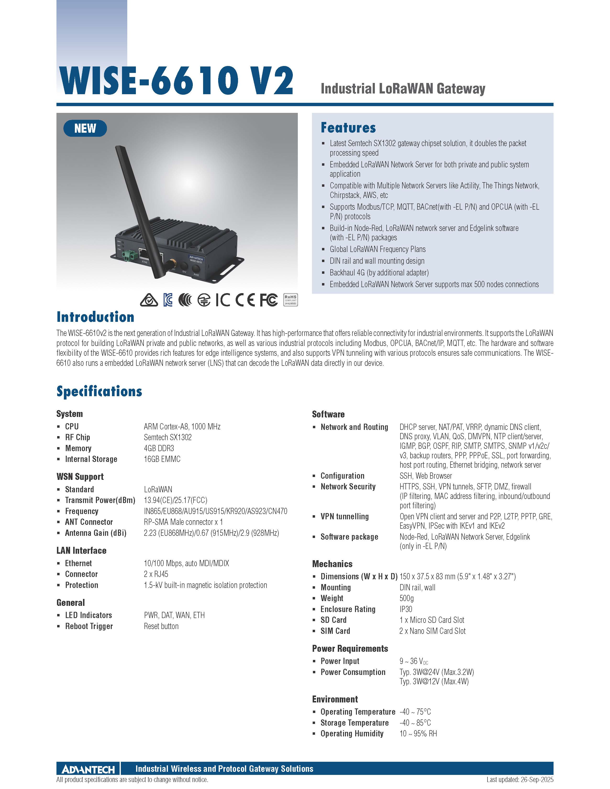 สินค้ายี่ห้อ ADVANTECH รุ่น WISE-6610 รายละเอียดสินค้า เกตเวย์ LoRaWAN เกรดอุตสาหกรรม (Industrial LoRaWAN Gateway) ประสิทธิภาพสูงที่รองรับการเชื่อมต่อเซนเซอร์ไร้สายได้สูงสุด 100 โหนด พร้อมรองรับโปรโตคอล MQTT และ Modbus TCP เพื่อการส่งข้อมูลขึ้นระบบ Cloud หรือ SCADA ได้อย่างยืดหยุ่นและปลอดภัยด้วย VPN Tunneling สำหรับโซลูชัน IoT ในโรงงานอัจฉริยะ ✅ ขอราคาพิเศษสำหรับงานโครงการติดต่อ Mobile : 063-879-9917 Line ID @aimonline