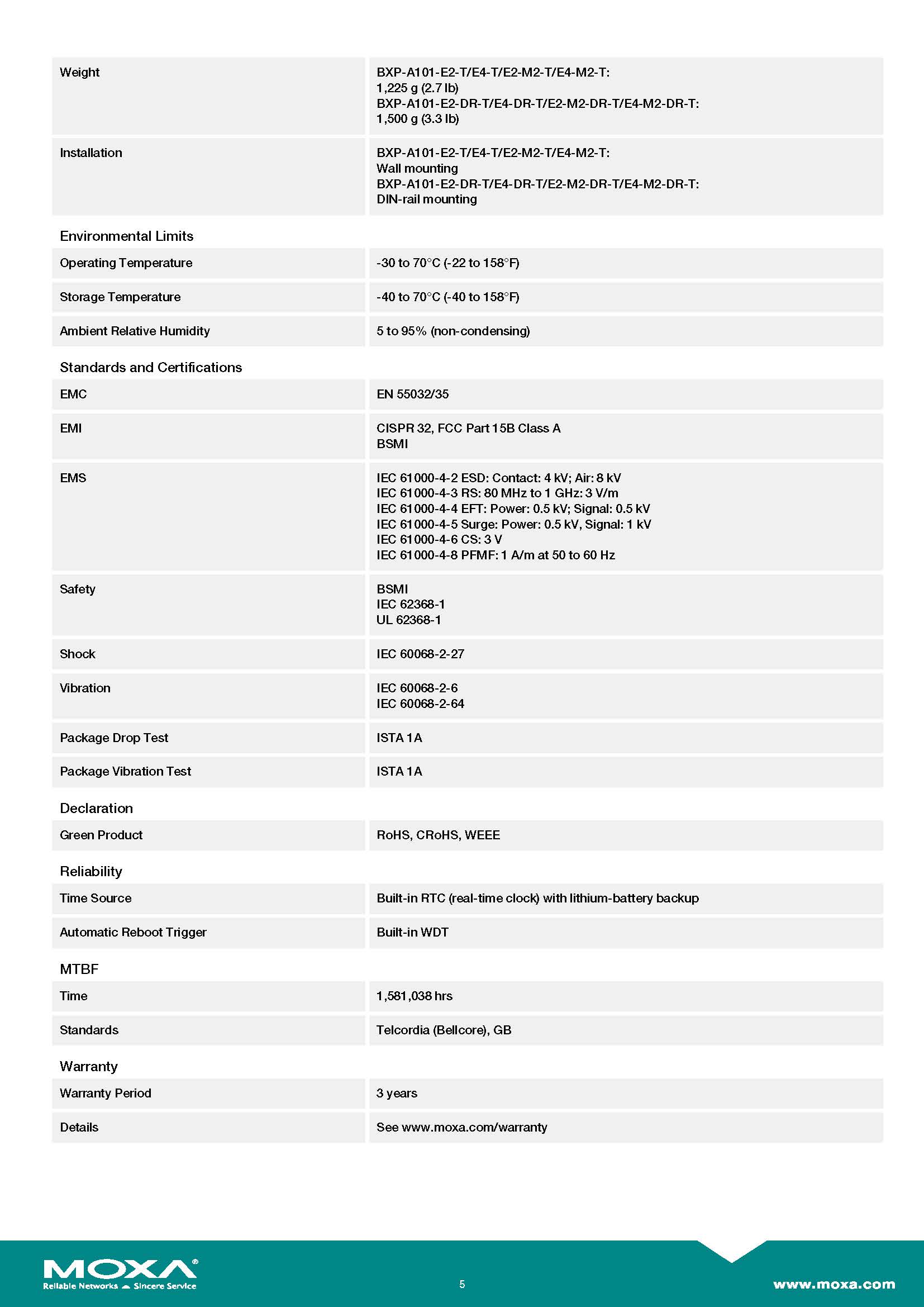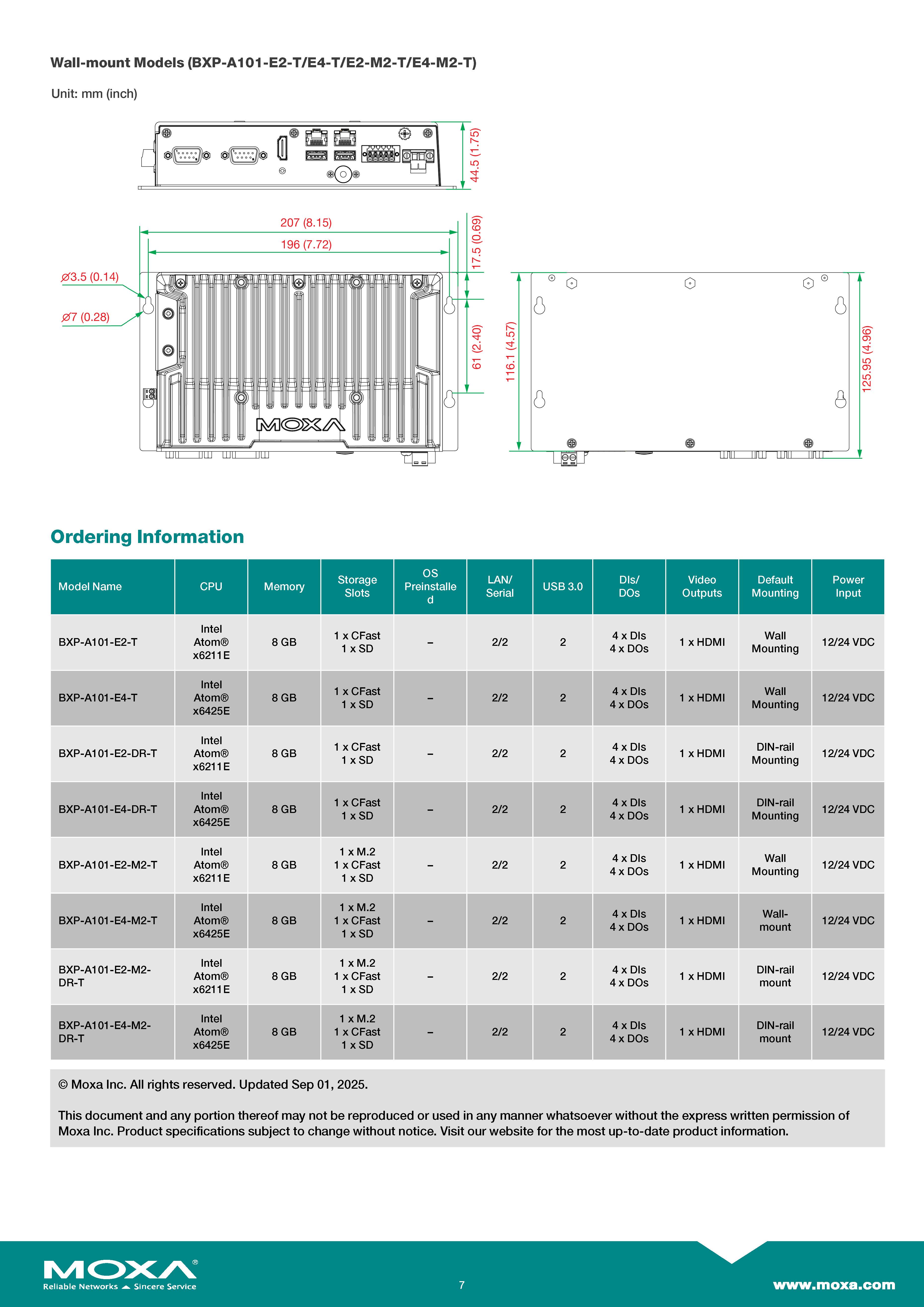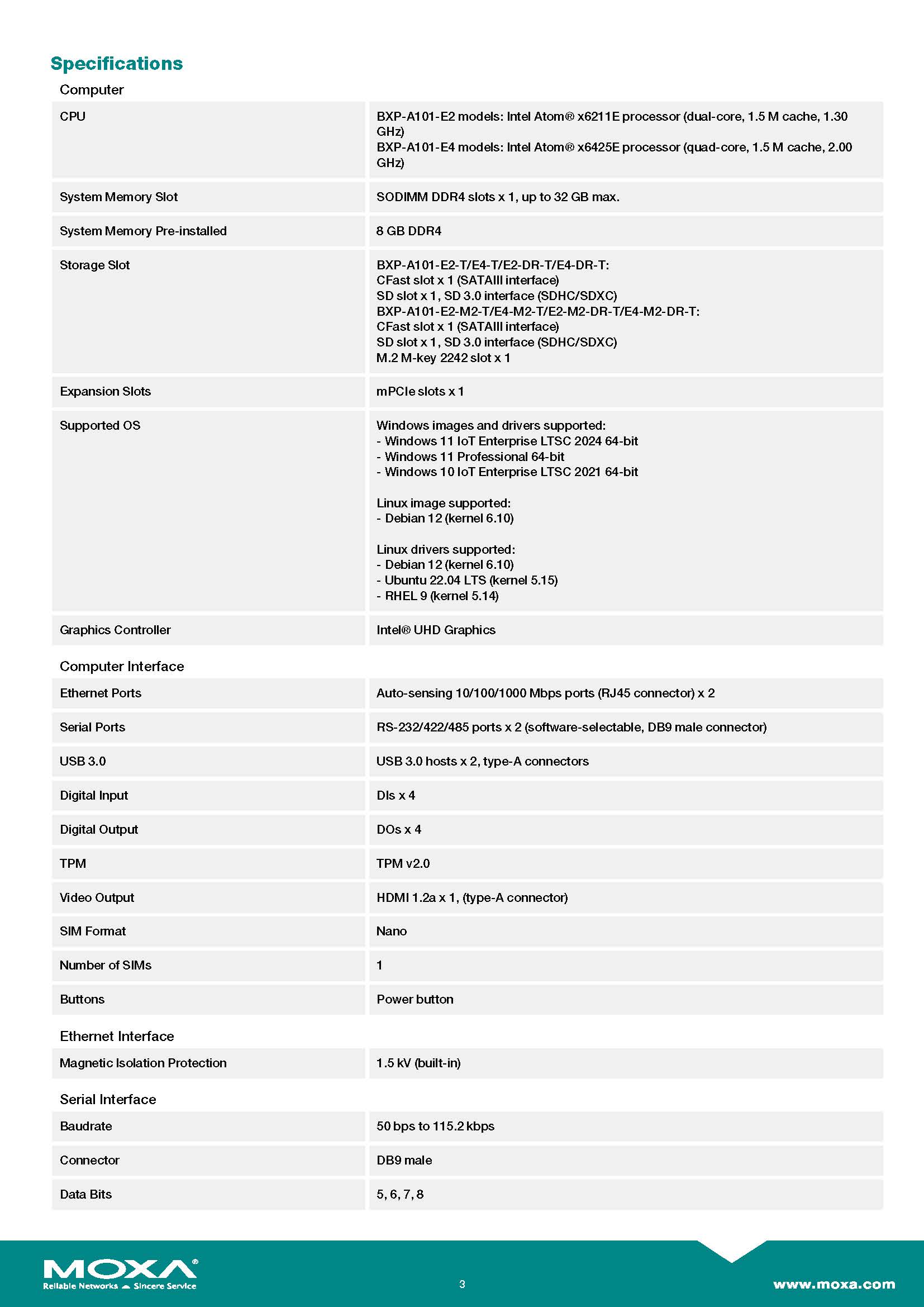 สินค้ายี่ห้อ MOXA รุ่น BXP-A101-E4-T รายละเอียดสินค้า คอมพิวเตอร์อุตสาหกรรมแบบติดผนังไร้แบตเตอรี่ (Battery-free Box Computer) ขุมพลัง Intel Atom® x5-E3940 ที่ออกแบบมาเพื่อลดความเสี่ยงและค่าใช้จ่ายในการบำรุงรักษาในพื้นที่อันตราย (Hazardous Locations) ด้วยดีไซน์ทนทานต่ออุณหภูมิโหดร้าย (-40 ถึง 70°C) และระบบระบายความร้อนไร้พัดลม เพื่อความปลอดภัยสูงสุดในยุค IIoT ✅ ขอราคาพิเศษสำหรับงานโครงการติดต่อ Mobile : 063-879-9917 Line ID @aimonline