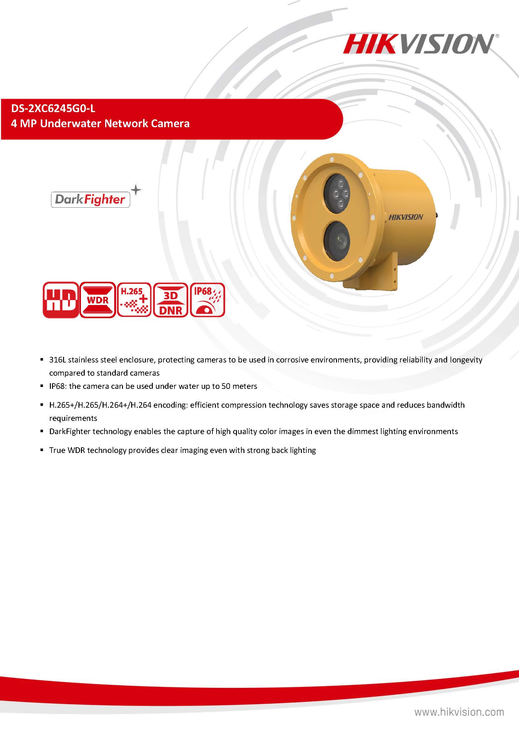 สินค้ายี่ห้อ HIKVISION รุ่น DS-2XC6245G0-L รายละเอียดสินค้า กล้องวงจรปิดเครือข่ายใต้น้ำ (Underwater Network Camera) ความละเอียด 4 ล้านพิกเซล ที่มาพร้อมโครงสร้างสแตนเลส 316L แข็งแกร่งทนทานต่อการกัดกร่อนและแรงดันน้ำได้ลึกถึง 50 เมตร (IP68) ผสานเทคโนโลยี DarkFighter และไฟ White Light ในตัวเพื่อการบันทึกภาพที่คมชัดในสภาพใต้น้ำที่แสงน้อย เหมาะสำหรับงานตรวจสอบระบบชลประทาน บ่อเลี้ยงสัตว์น้ำ และงานวิศวกรรมทางทะเล ✅ ขอราคาพิเศษสำหรับงานโครงการติดต่อ Mobile : 063-879-9917 Line ID @aimonline
