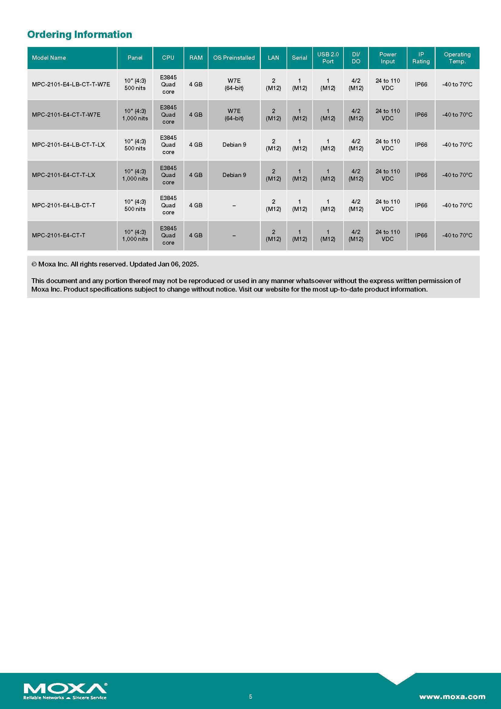 สินค้ายี่ห้อ MOXA รุ่น MPC-2101-E4-LB-CT-T-LX รายละเอียดสินค้า คอมพิวเตอร์หน้าจอสัมผัสระดับอุตสาหกรรม (Industrial Fanless Panel Computer) ขนาด 10.1 นิ้ว ขับเคลื่อนด้วยขุมพลัง Intel Atom Quad-core พร้อมระบบปฏิบัติการ Linux ในตัว โดดเด่นด้วยหน้าจอสัมผัสแบบ Multi-touch (PCAP) ที่ตอบสนองได้อย่างแม่นยำ มาพร้อมพอร์ตเชื่อมต่อ Gigabit LAN 2 ช่อง, พอร์ตซีเรียล 2 ช่อง และพอร์ต I/O ดิจิทัล ภายใต้ตัวเรือนไร้พัดลมมาตรฐานกันน้ำกันฝุ่น IP66 (ด้านหน้า) ที่ผ่านการเคลือบแผงวงจรเพื่อป้องกันความชื้นและการกัดกร่อนขั้นสูง (Conformal Coating) ทนทานต่ออุณหภูมิสุดขั้วตั้งแต่ -40 ถึง 70°C (-T) ตอบโจทย์การเป็นหน้าจอสั่งการ (HMI) ที่อึดถึกทนสำหรับระบบอัตโนมัติในโรงงานและสภาพแวดล้อมที่เปียกชื้นหรือเต็มไปด้วยสารเคมีได้อย่างมีเสถียรภาพสูงสุด ✅ ขอราคาพิเศษสำหรับงานโครงการติดต่อ Mobile : 063-879-9917 Line ID @aimonline *ราคาสินค้าอาจจะมีการเปลี่ยนแปลงโดยไม่แจ้งให้ทราบล่วงหน้า รบกวนติดต่อฝ่ายขายเพื่ออัพเดทราคา